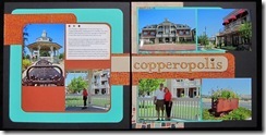 Club Scrap’s PSL continues and this week the challenge is to use paper from one kit and embellishments from a second one. This layout was created with base papers from Adobe and Artifacts. Brads are from Rhapsody. The layout is about our trip this summer to Copperopolis in the Gold Country. The sketch used is from the Big Picture Double Take class.